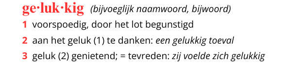 Dat is wat onze Van Dale ervan zegt. “Door het lot begunstigd”….? “Aan het geluk te danken….? “Een gelukkig toeval….? Wat betekent dat allemaal? Het lot, het geluk, toeval? Dat wekt de indruk dat je zelf niets te zeggen hebt over je geluk. Het zal je niet verbazen dat ik me daar niet in kan vinden. Geluk is namelijk een gevoel. En je hebt wel degelijk invloed op hoe je je voelt. De derde betekenis is naar mijn idee dus de enige juiste, je voelt je gelukkig en daar komen keuzes aan te pas.